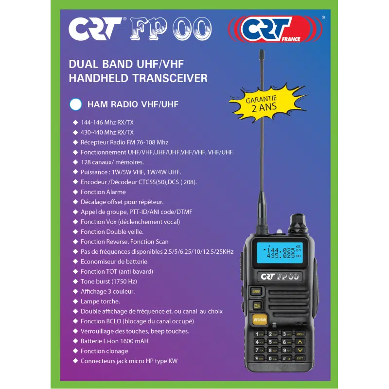 | Fréquences | RX/TX : 144-146 Mhz / 430-440 Mhz |