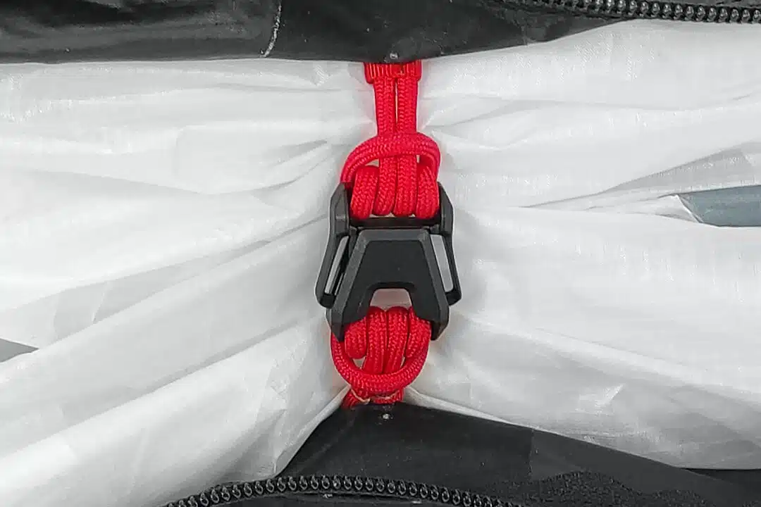 Une tirette anti-snag pratique évite de coincer le tissu du parapente ou des suspentes par inadvertance.
