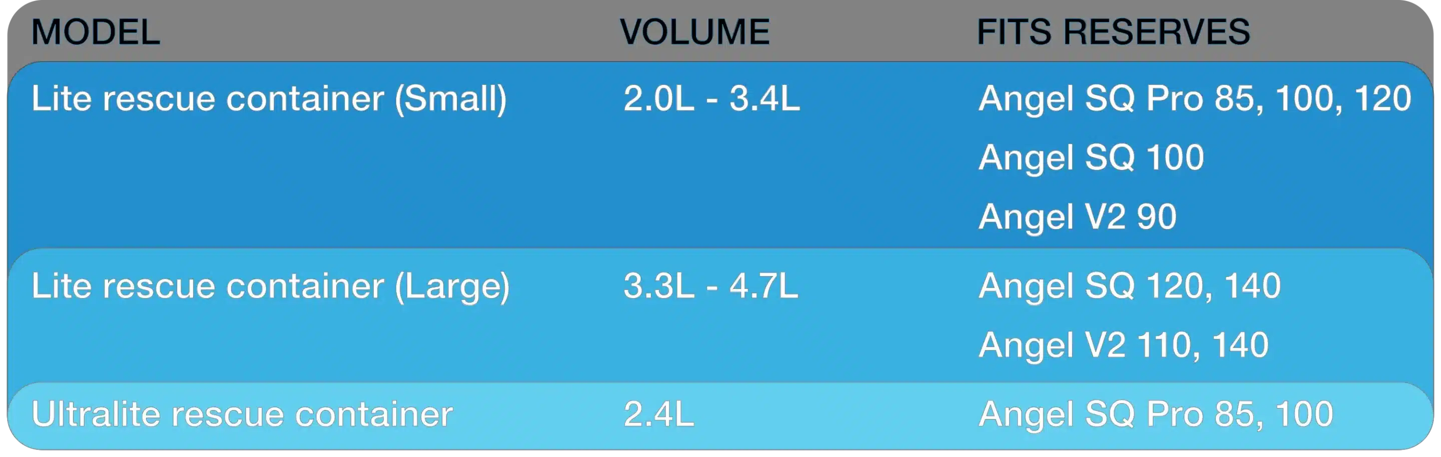 Quand il s’agit de stabilité et de sécurité pour les secours de forme ronde, rien ne remplace la surface. Pour cette raison, nos deux tailles d’Angel sont “grandes” et apportent un grande marge pour les PTV d’homologation. Avec ses deux tailles, l’Angel couvre tous les PTV jusqu’à 140kg (PTV total, secours compris). Il est homologué EN et LTF aux normes EN 12491 et LTF 91/09.