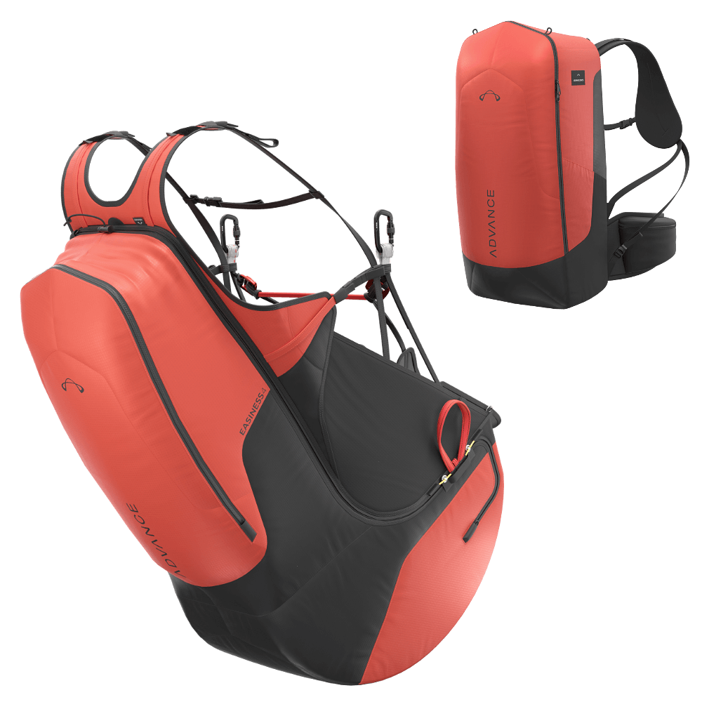 Un support dorsal de forme ergonomique et de larges bretelles garantissent un grand confort de transport lors de l’ascension. En vol, l’enveloppe d’assise formée en 3D de l'Advance Easiness 4 les longs cuissardes et les forces parfaitement réparties sur l’accélérateur assurent un pilotage agréable en toute détente. Le sac à dos et le compartiment dorsal offrent suffisamment de place, mais aussi une poche accessible dans les deux modes d’utilisation, pour un ensemble encore plus confortable.